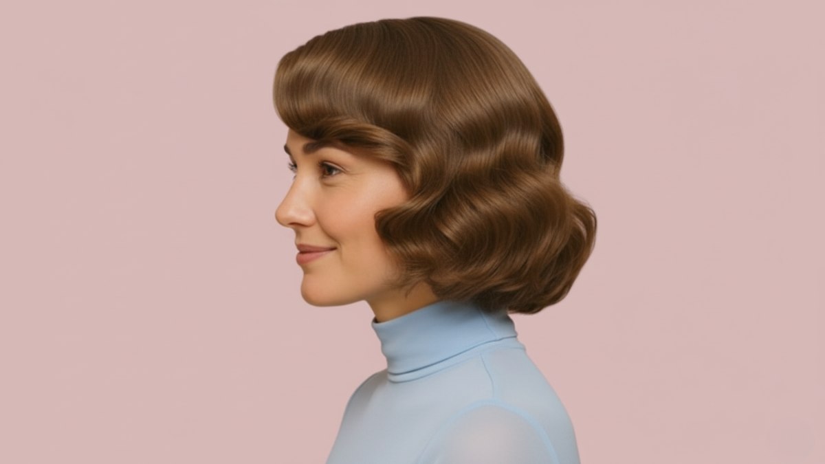 L’un des éléments les plus marquants de cette coiffure est la belle frange balayée sur le côté. Ce n’est pas une frange classique. Elle balaie élégamment le front en une arc gracieuse et fluide. Partant d’une raie légèrement décentrée, la frange se courbe vers le côté opposé, s’arrêtant juste au-dessus du sourcil. Ce détail asymétrique ajoute une touche de mystère et adoucit l’ensemble du look, apportant juste la bonne dose de charme vintage.