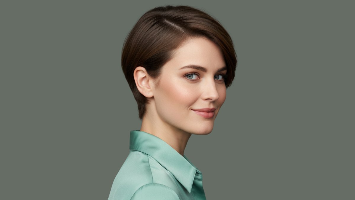 La couleur est brune, presque chocolat noir, avec de subtiles variations de profondeur. Cette approche monochrome fonctionne parfaitement avec les lignes nettes de la coupe, mettant en valeur la forme et la structure sans distraction. La finition lisse et brillante suggère des cheveux en excellente santé, bien soignés, qui réfléchissent la lumière et offrent une apparence luxueuse.
