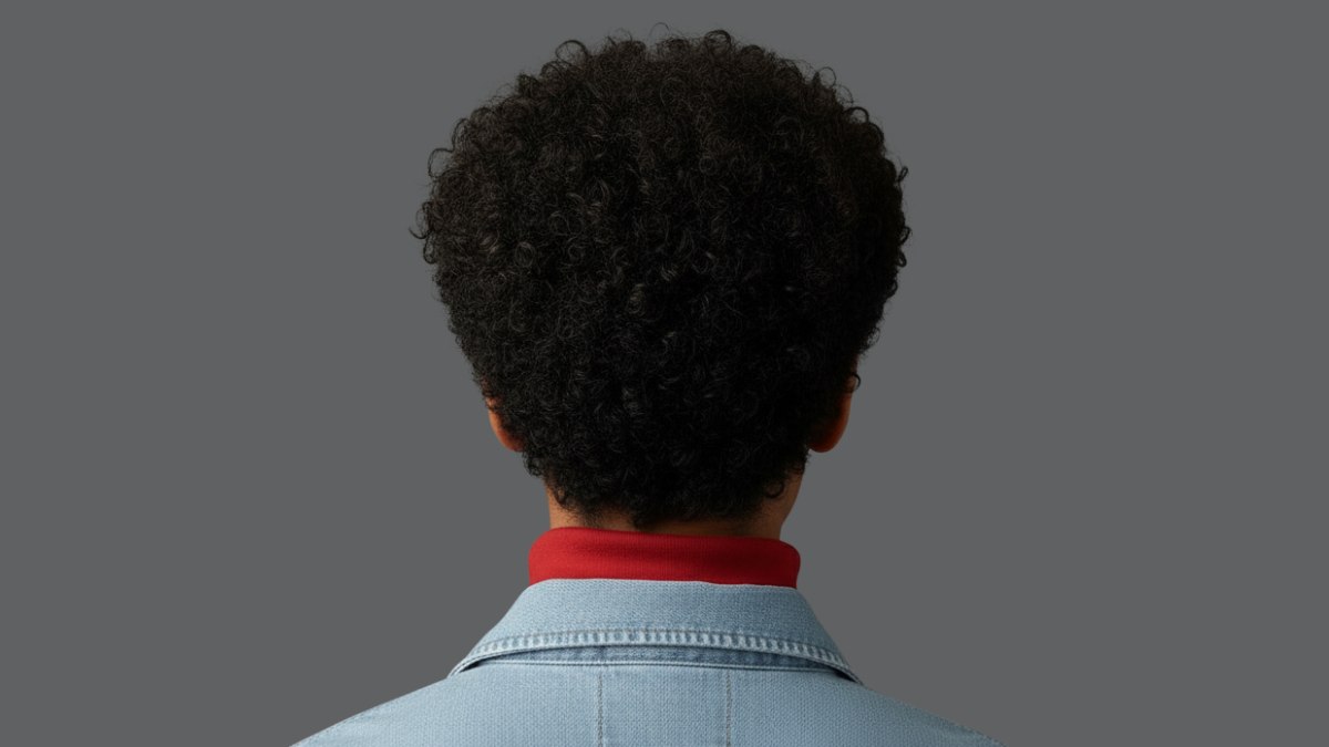 La tenue est choisie avec beaucoup de justesse pour accompagner cette coiffure. La chemise en denim clair offre une base décontractée, tandis que le col roulé rouge porté en dessous apporte chaleur et sophistication. Cette association de couleurs fonctionne à merveille avec les cheveux noirs naturels. Le rouge profond rappelle les sous-tons chauds de la chevelure, et le denim bleu froid apporte du contraste sans entrer en concurrence.