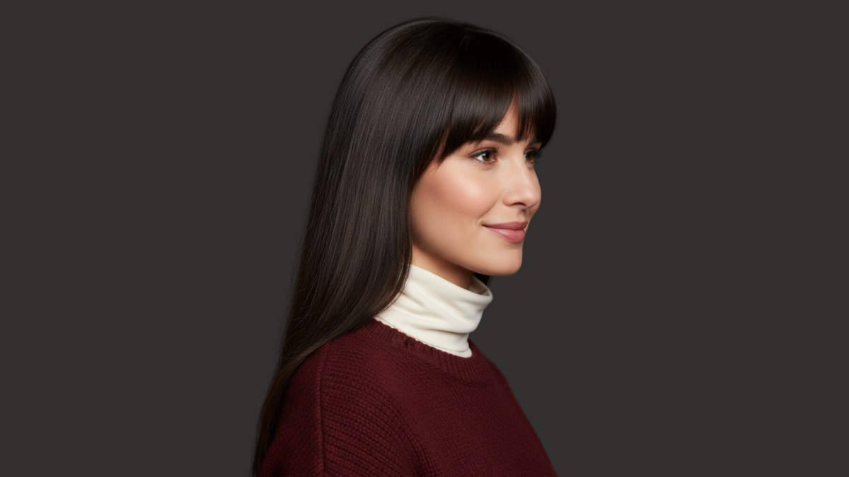 L’association avec la tenue est parfaitement harmonieuse. Le col roulé crème offre une base douce et neutre qui ne rivalise pas avec la chevelure, tandis que le pull en maille bordeaux apporte une chaleur qui fait écho aux nuances chocolat de la couleur. Le col montant crée une ligne élégante qui équilibre la ligne horizontale de la frange, et la palette de couleurs chaudes et automnales renforce la cohérence de l’ensemble.