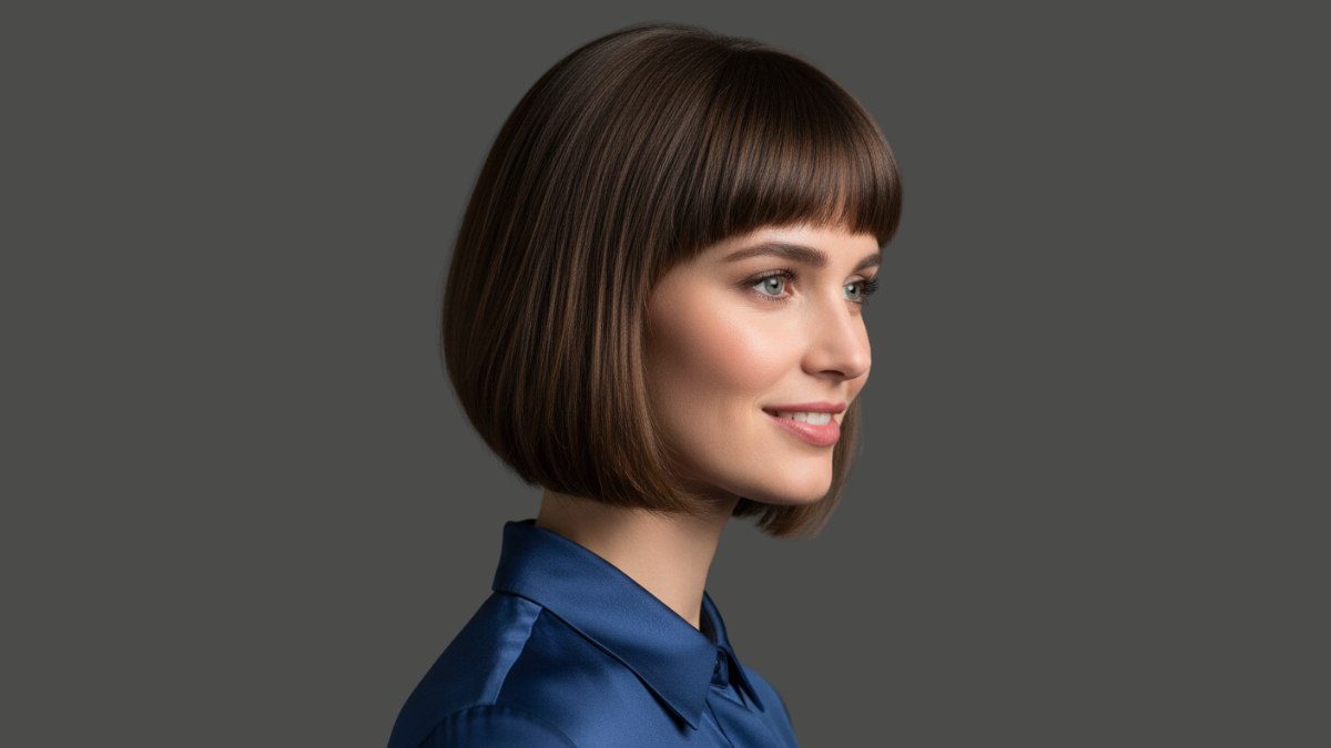 La couleur des cheveux est un brun chocolat avec de subtiles variations de profondeur qui accrochent la lumière. La chevelure présente une brillance naturelle qui témoigne d’une excellente santé et de soins adaptés. Les cheveux semblent épais, donnant du corps et du mouvement au carré, sans frisottis ni mèches rebelles venant perturber la ligne nette.