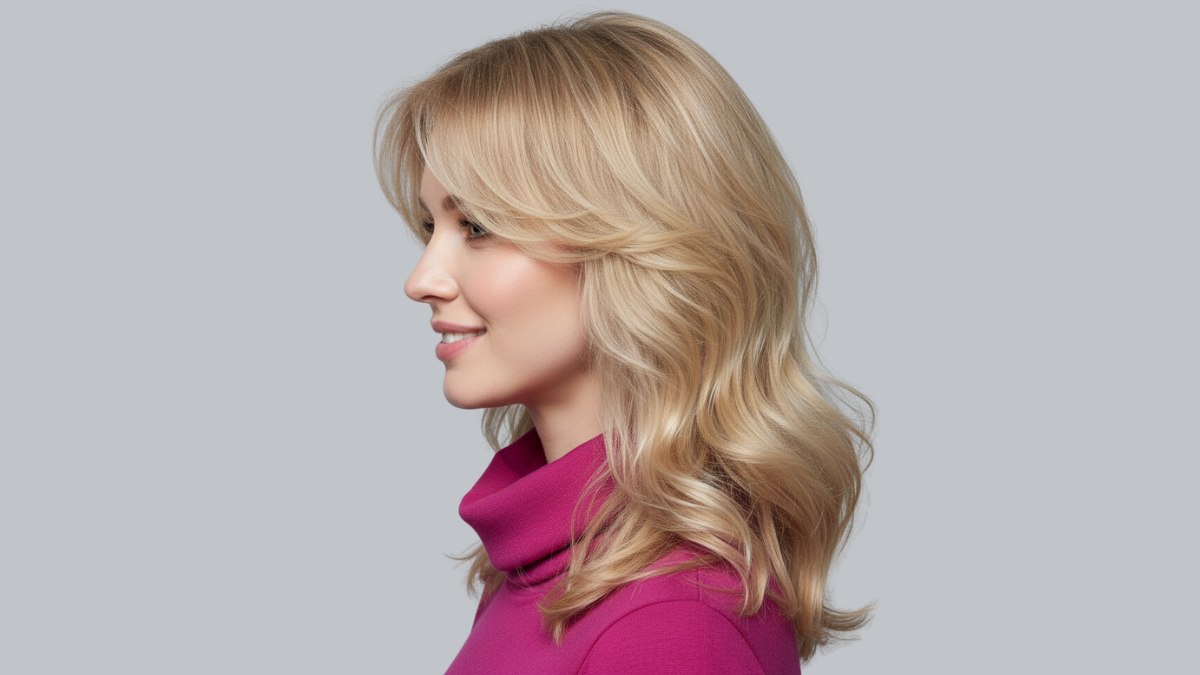Le col roulé magenta vif constitue un choix audacieux pour accompagner cette coiffure. Sa teinte crée un contraste saisissant avec le blond chaud, faisant ressortir à la fois la couleur et le mouvement des cheveux. L’encolure montante souligne le dégradé autour du visage et attire le regard vers la brillance et la légèreté des ondulations.