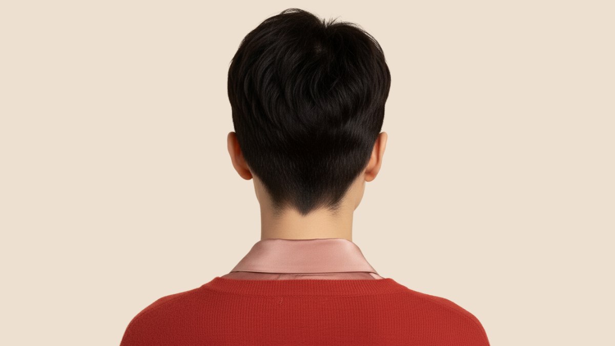Le pull orange-rouge et le col de chemise mauve composent une harmonieuse palette de couleurs qui accompagne parfaitement l’audace de cette coupe courte. Les tons chauds de la tenue adoucissent l’intensité du noir profond, pour un look à la fois affirmé et équilibré.