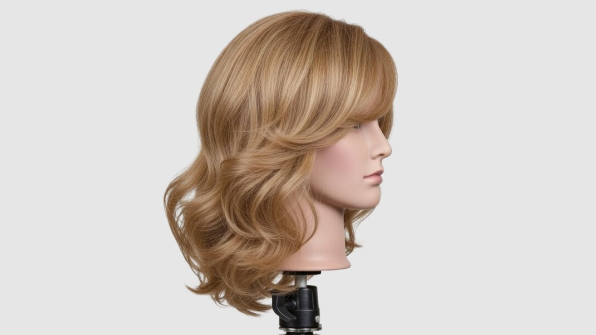 The forward side section on the left is smoothed and tucked neatly behind the left ear, while the rest of the hair is brushed out into a soft fall of waves and curl.