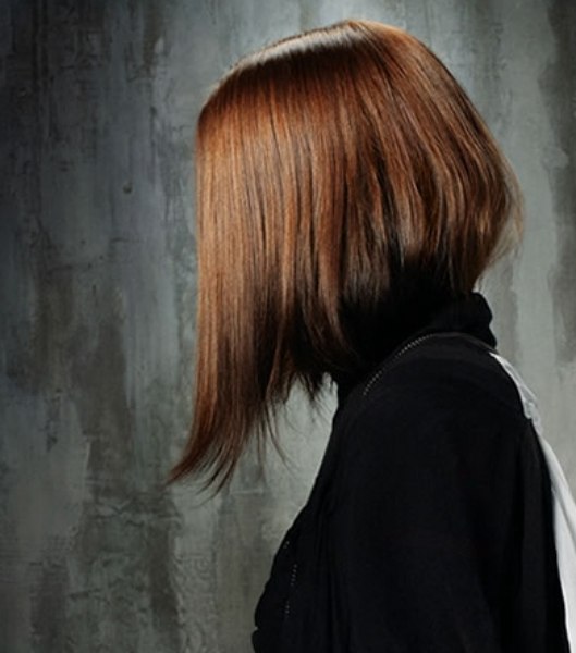 This A-line bob, or angled bob, takes it to the extreme. The shape is exaggerated in such a thrilling way with its long, sweeping lines and the steep angle from about shoulder length back to the very long front. This shape alone gives the hair such a contagious dynamic.