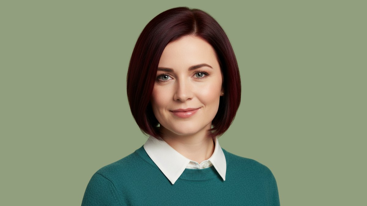 This refined bob showcases a deep auburn color with mahogany undertones that add warmth and dimension to the overall look. The cut itself is grazing just below the chin with a subtle A-line shape that's longer in front and gradually tapers toward the back.