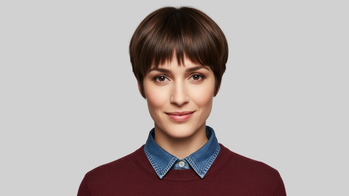 The burgundy sweater paired with a denim shirt creates a perfect complement to this short haircut. The contrast between the casual denim and the refined knitwear mirrors the balance the haircut strikes between approachable and elegant, while the rich wine tone enhances the warmth in the brown hair color.