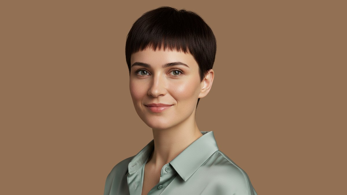 This ultra-short pixie cut exudes confidence and contemporary edge. The hair is cut very short through the sides and back, creating a clean shape that emphasizes the bone structure of the face and neck.