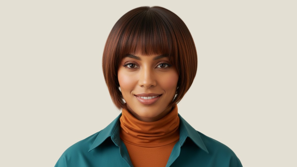 The styling strikes the perfect balance between polished and relaxed. The hair has been blow-dried with just enough curve at the ends to create softness, while the fringe is cut to fall naturally across the forehead with textured ends that feel modern.