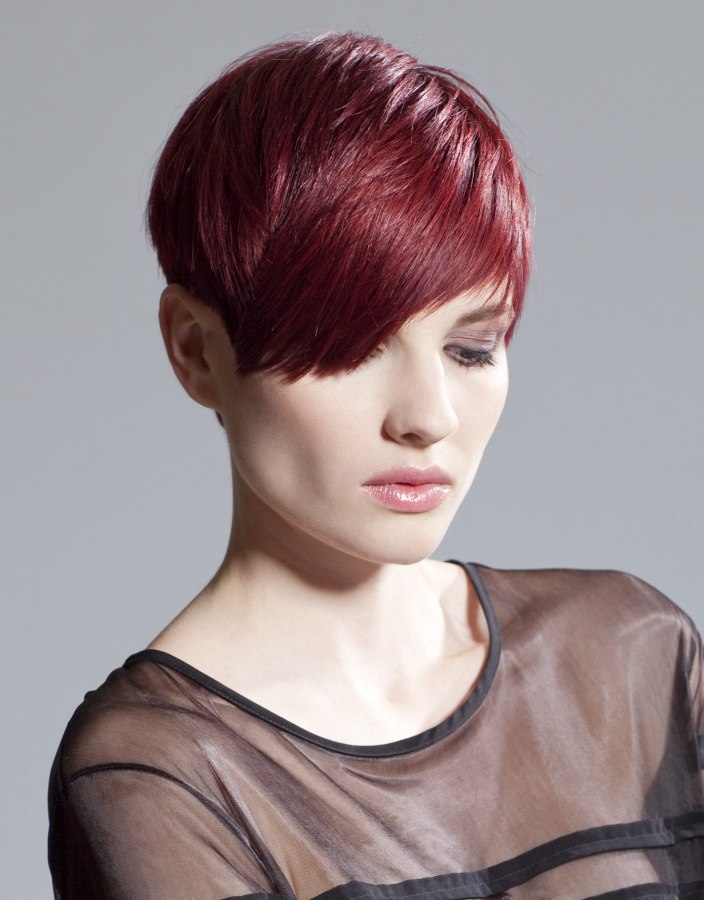 It may be a tomboy cut, but with the dark rose color, it immediately presents its romantic and feminine side. Still playful and rebellious with a spunky attitude, this well-textured short haircut is styled in a very chic forward direction.