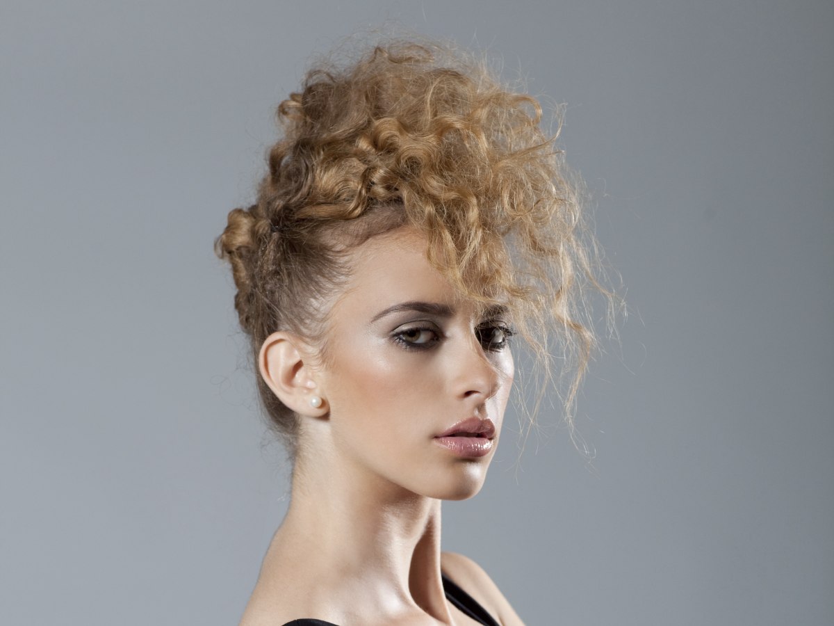 The veil of curls that build up above her forehead is much too refined to be called bangs. In fact, it is not the frontal hair at all but the result of twisting and twirling the hair all around to form an unconventional updo.
