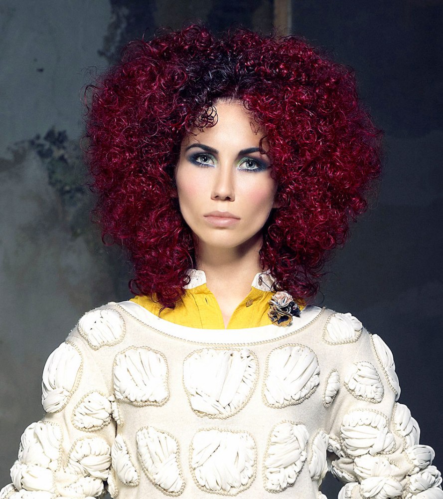 Such a glamorous and beautifully dramatic look is best achieved with naturally curly and kinky hair. As breathtaking as the hairstyle is, the hair color gives it a cosmic dimension with a black underlayer and an amethyst and dark cherry body.