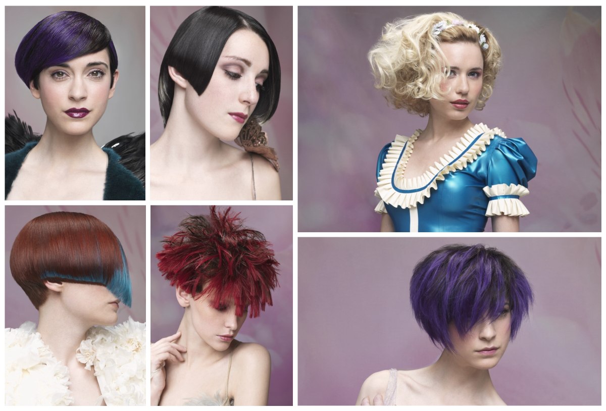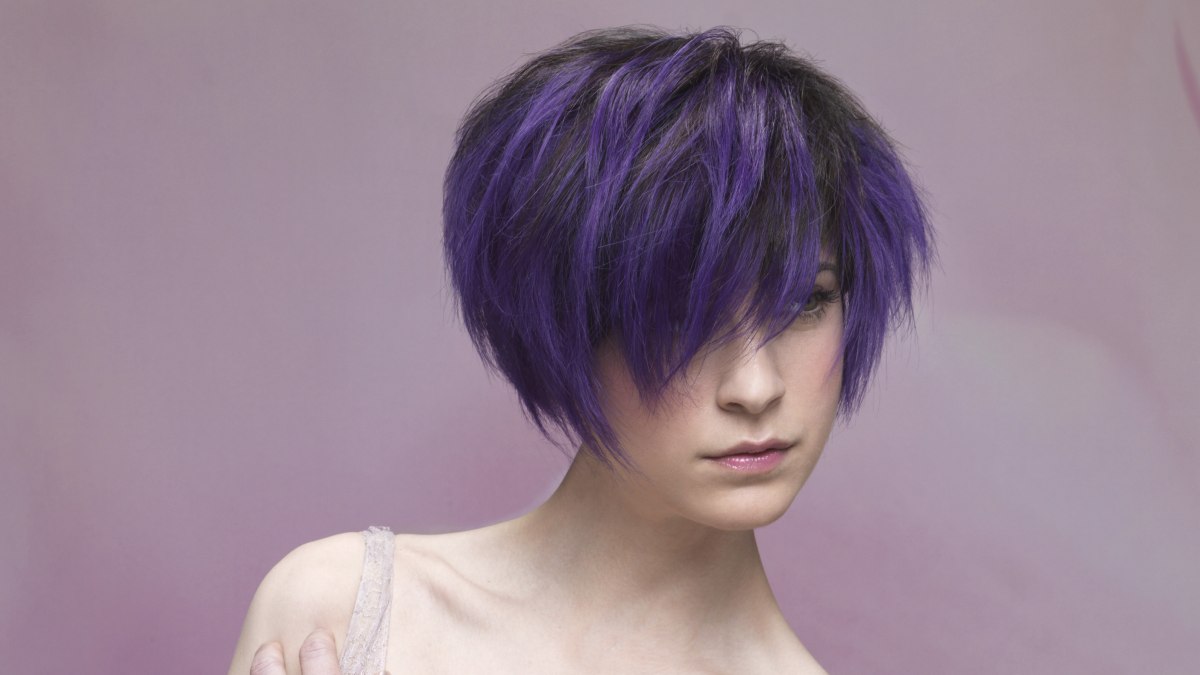 The new short cut features feathery texture, varying lengths, and a striking contrast of black and magical morning-glory purple. The fringe sits low, while the volume remains high.