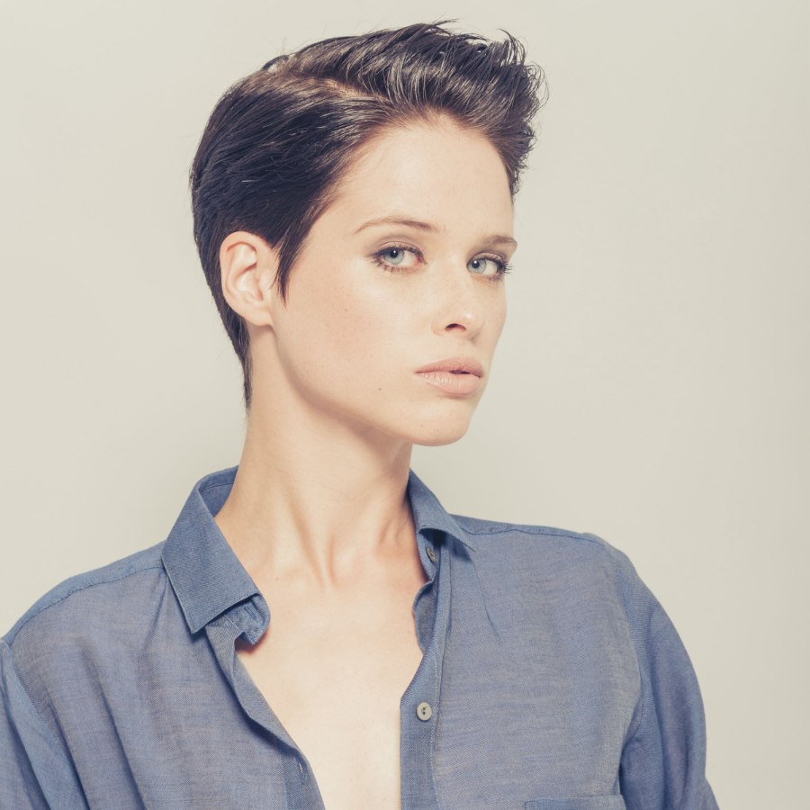 The sides of this short cut, which follow a traditional masculine template, are styled vertically and sleekly with a hint of gel for good hold and a moist effect. The top is sectioned into two parts and styled with frolicking curls that extend deep into her forehead. It’s a little rockabilly and quite trendy.