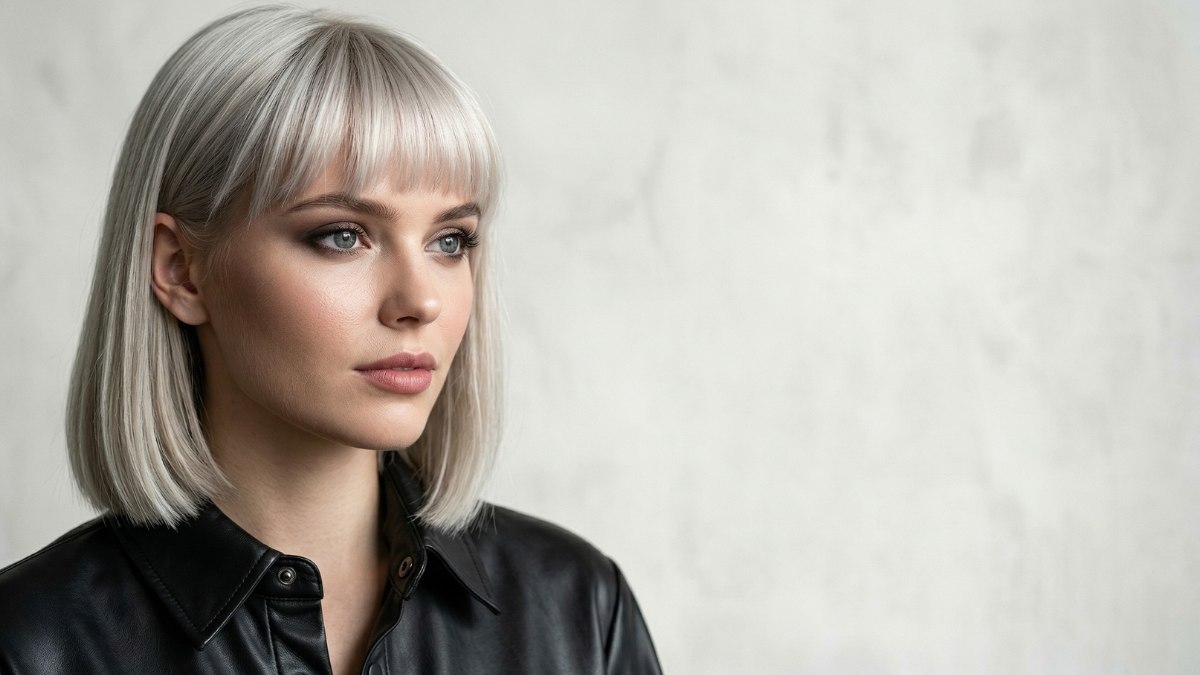 Cut to shoulder length with a precise blunt fringe that skims the eyebrows, this platinum blonde bob is an exercise in pure confidence. The hair is entirely uniform in its silver-white hue, with no visible dimension or contrast, giving it a striking, almost sculptural quality.