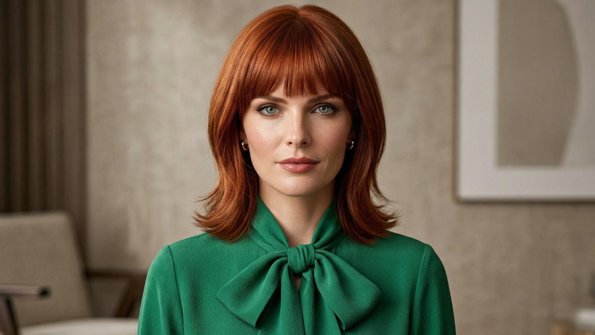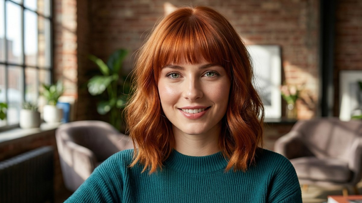 This vibrant style pairs a rich copper tone with gentle waves that catch the light, creating a look that seems to glow from within. The blunt fringe sits just above the eyebrows, adding a retro-inspired edge that keeps the overall aesthetic feeling fresh and modern.