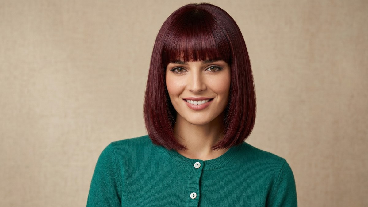 This burgundy blunt bob with a straight fringe is a gorgeous, bold color-and-cut combination. The bob is cut to just above the shoulders in a clean, blunt line that provides a beautiful "swing" as you move. The fringe is equally precise: straight, full, and cut to sit just at or slightly above the eyebrows.