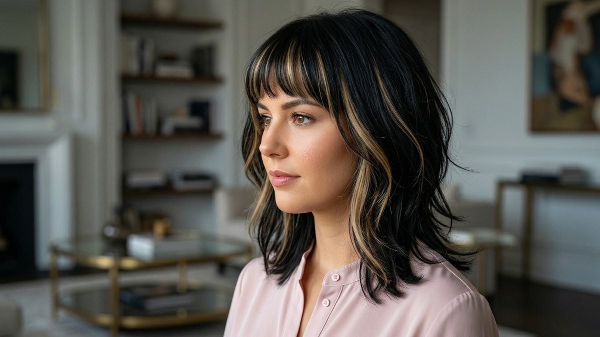 This shoulder-length style features a deep, jet-black base color contrasted with bold, face-framing highlights in a warm blonde tone. These highlights aren't meant to be subtle; they are dramatic and strategically placed to draw the eye toward the face, creating a sense of movement that makes the hair feel alive.