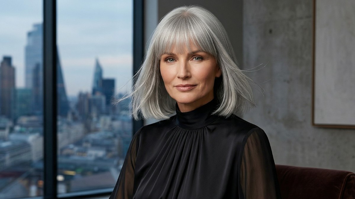 The cut itself is impeccably executed: a clean, blunt bob that hits the shoulders, paired with a straight, brow-skimming fringe that provides a high-fashion feel. The silver tones move through the hair with natural variation, where deeper pewter notes sit alongside brighter, almost white highlights to create depth.