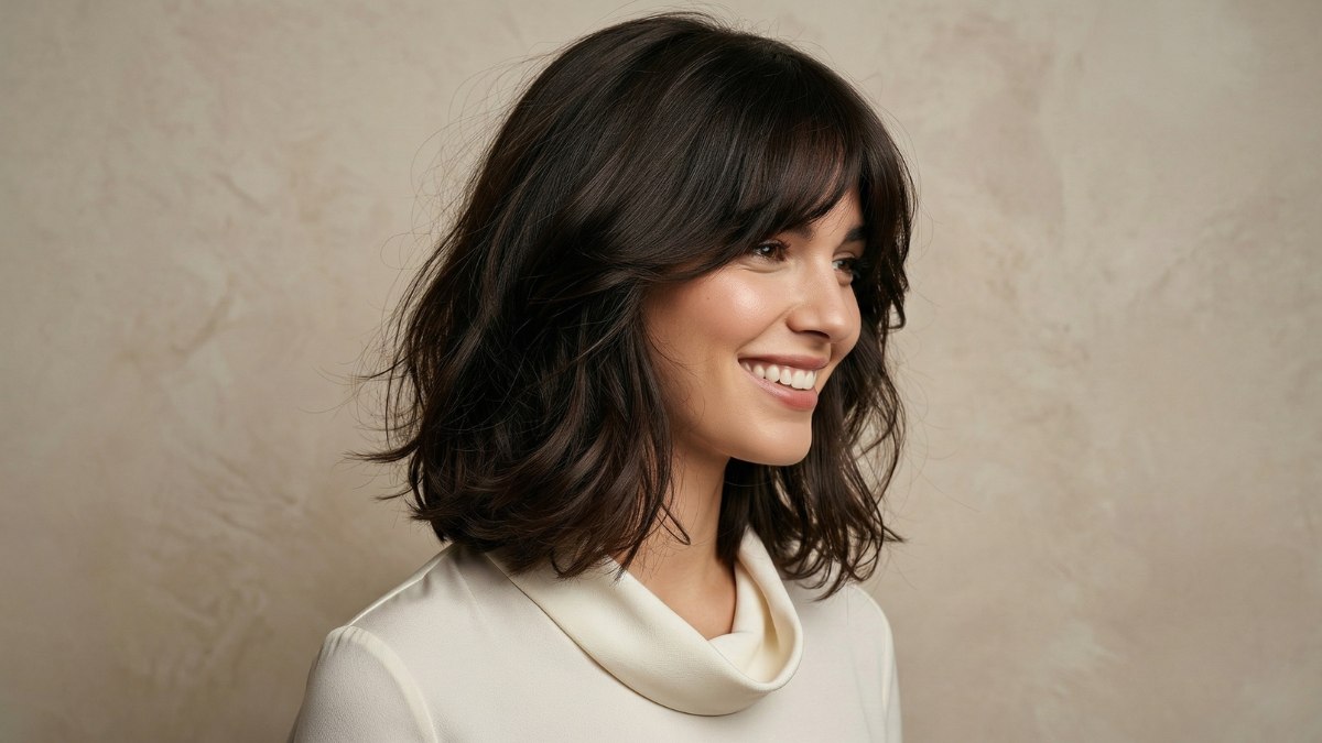 This brunette shag with a curtain fringe is one of the most versatile and flattering cuts in the shoulder-length category. This particular version features a dark brunette base with subtle, warm highlights throughout the lengths, giving the hair a very natural dimension.
