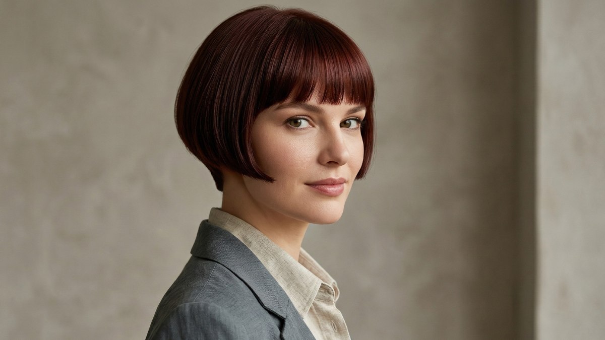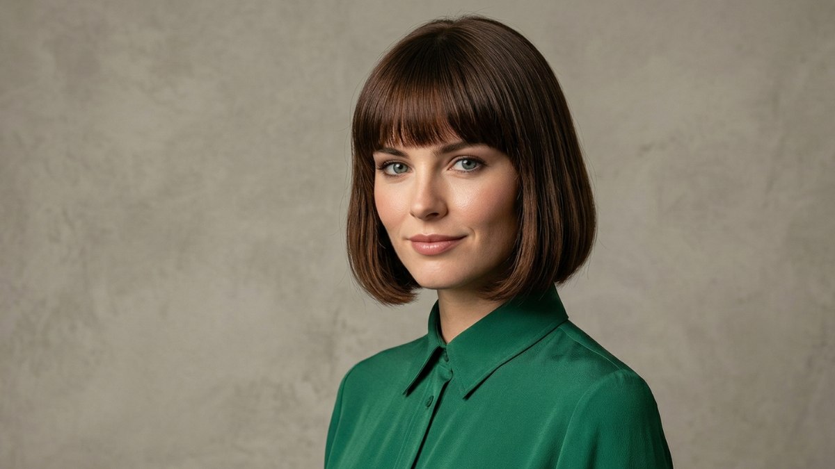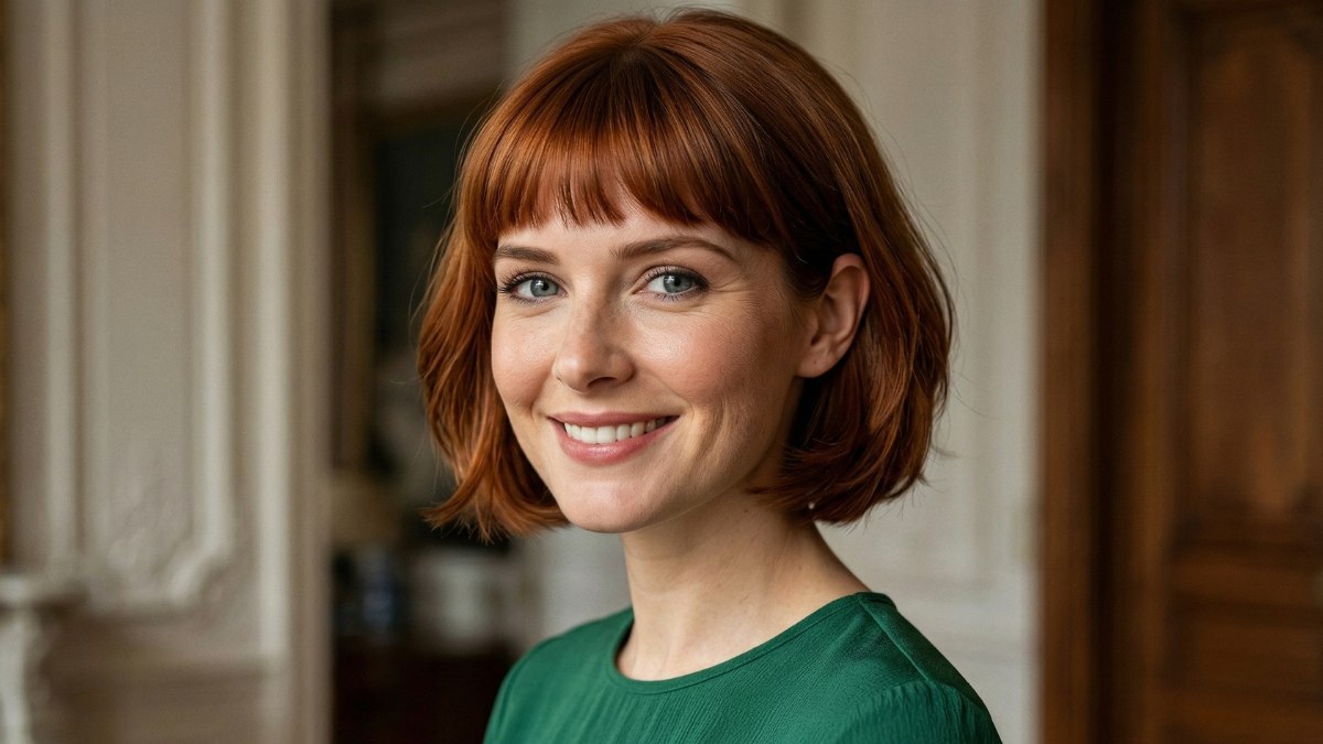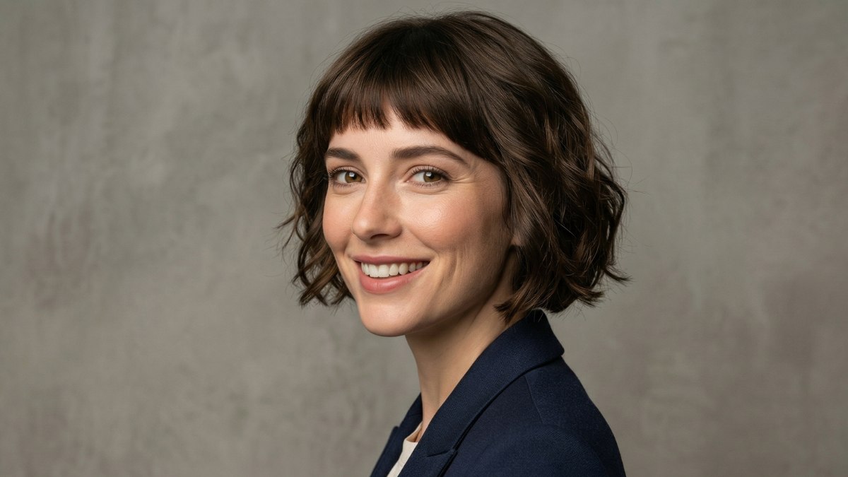 A blunt fringe sits neatly just above the brows, adding a touch of retro-inspired charm without overwhelming the face, while the rest of the hair falls just below the jawline in relaxed, tousled waves that feel modern and wearable.