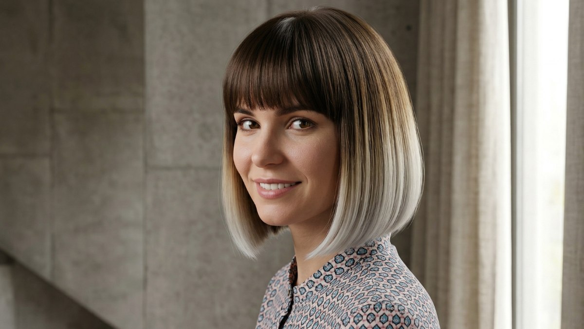The cut is a sleek, classic bob that falls just below the jawline, finished with a straight-across fringe. The overall shape is smooth and rounded, allowing the ombré transition to take center stage without being interrupted by heavy texture or waves. The result is a study in contrast: dark and light, structured and flowing, bold and elegant all at once.