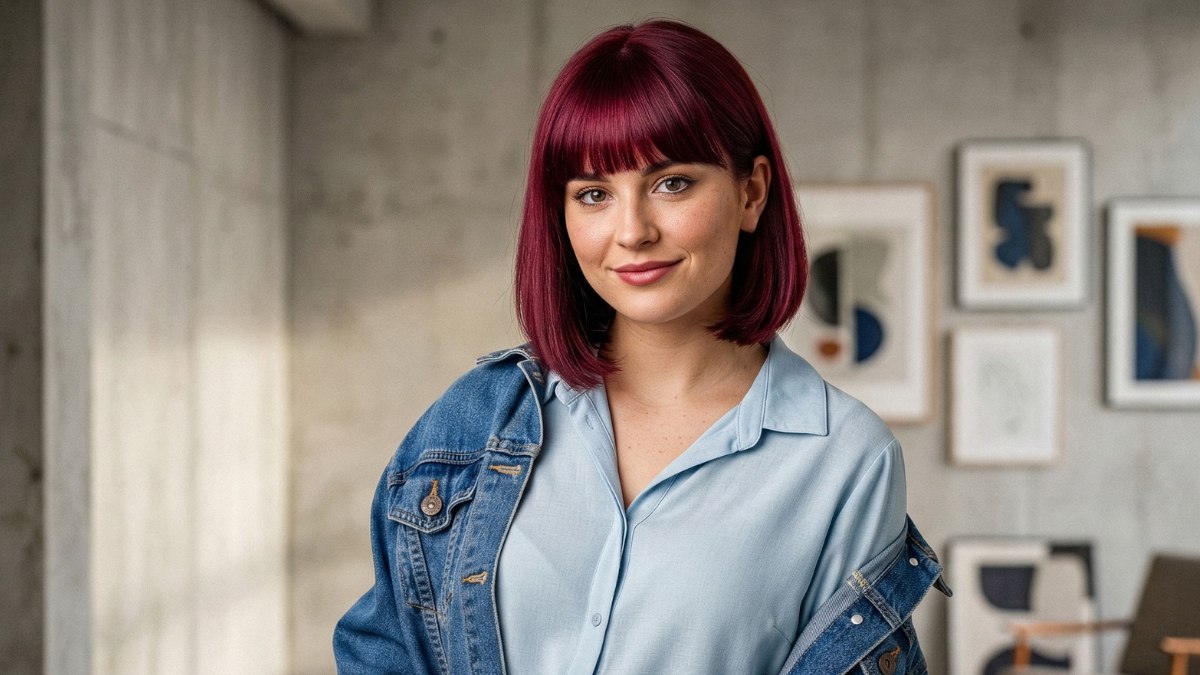 This look is all about energy. The cherry-red bob sits right at collar length, with a straight fringe that falls neatly across the forehead. Clean, confident, and just a little bit retro. The color is deep, landing somewhere between burgundy and true red, giving the whole look a warm glow.