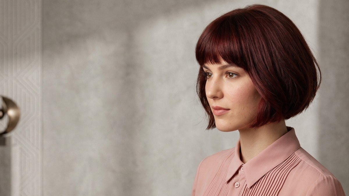 The hair color is a deep, warm burgundy-brown: rich and glossy, with a natural shine that speaks to healthy, well-maintained hair. The overall effect is sophisticated and every line in this cut is purposeful. Nothing is random. And yet, somehow, the whole thing feels natural.