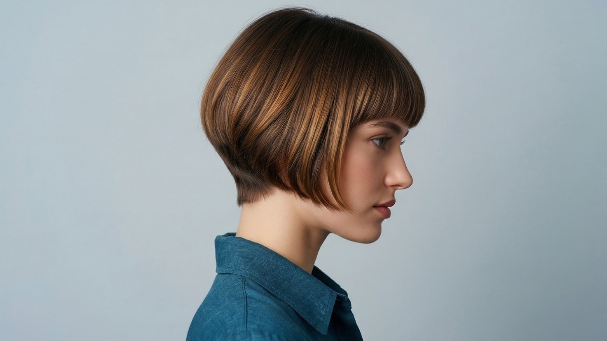 The hair color is a warm chestnut brown with caramel highlights that give the cut a beautiful, sun-touched depth. The highlights follow the shape of the cut, adding a subtle shimmer that keeps the style from feeling too heavy or flat. The result is a look that is both structured and luminous.