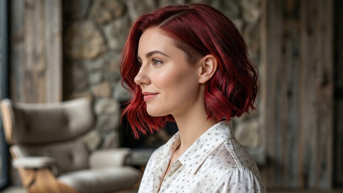 This look strikes a beautiful balance between relaxed and refined. It is a collar-length cut with a gentle wave through the ends, giving the whole style soft movement. The color is a vivid red and bright enough to be striking, but with enough warmth to be wearable.