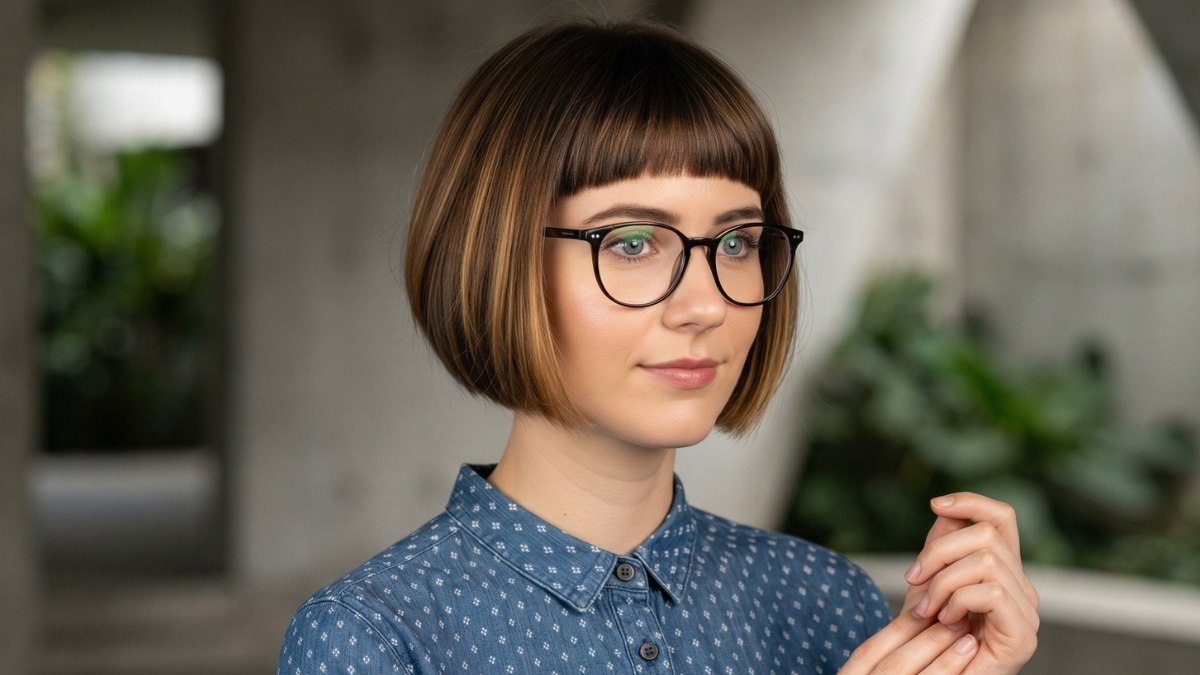 What makes this look particularly special is how it pairs with the round tortoiseshell glasses. It is a combination that feels very put together. The short fringe sits high above the frame, and the glasses become part of the style, not an afterthought. This is a look that works well with accessories, which makes it incredibly versatile.