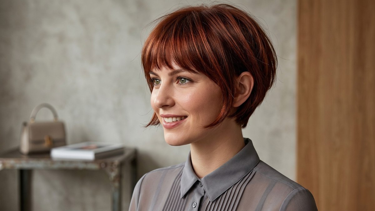 This is a cut for a woman who wants the best of both worlds: the ease of a pixie and the softness of a bob. This hairstyle sits somewhere between the two, with layers that are short at the sides and back but longer and more textured on top, finishing in a soft fringe that falls loosely across the forehead. The overall silhouette is rounded and full of movement.