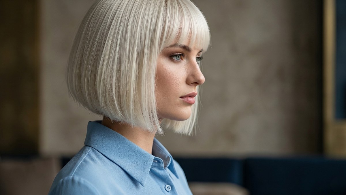 This blonde is sleek, sharp, and striking. The cut is a slightly angled, just-below-the-chin bob with a blunt fringe, clean lines, a smooth finish, and a shape that is both modern and timeless. But it is the color that truly sets this style apart.