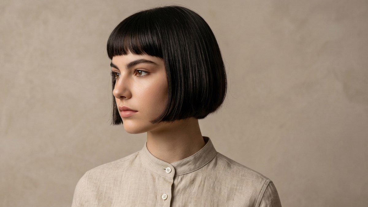 There is a reason this sharp, short bob has been a symbol of style and independence for over a century. It is one of those rare cuts that exists outside of trends: it does not follow them, it sets them. The hair is jet black, perfectly straight, with a blunt fringe and a length that sits right at the jaw.