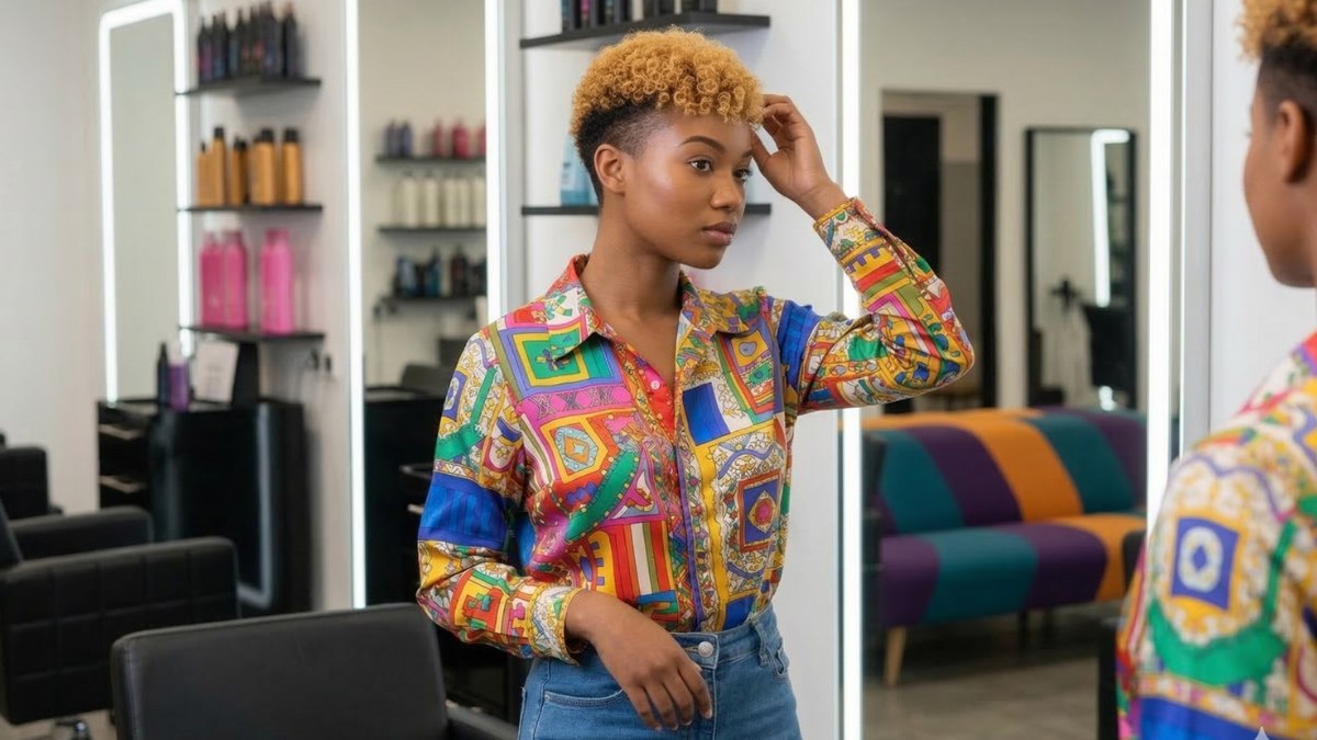 The colorful, cartoon-inspired baroque print on her shirt speaks directly to the playful artistry happening in her hair. Both the style and the shirt share the same spirit: expressive, creative, and just the right amount of maximalist.