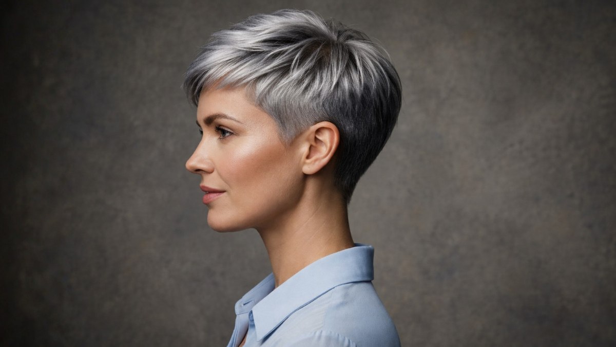 This pixie is where sophistication meets a rebellious spirit. This cut is all about the contrast between the metallic silver color and the darker, very short sides and back. By keeping the color bright on top and natural at the nape of the neck, you create a visual lift that makes the hair appear thicker and more voluminous.