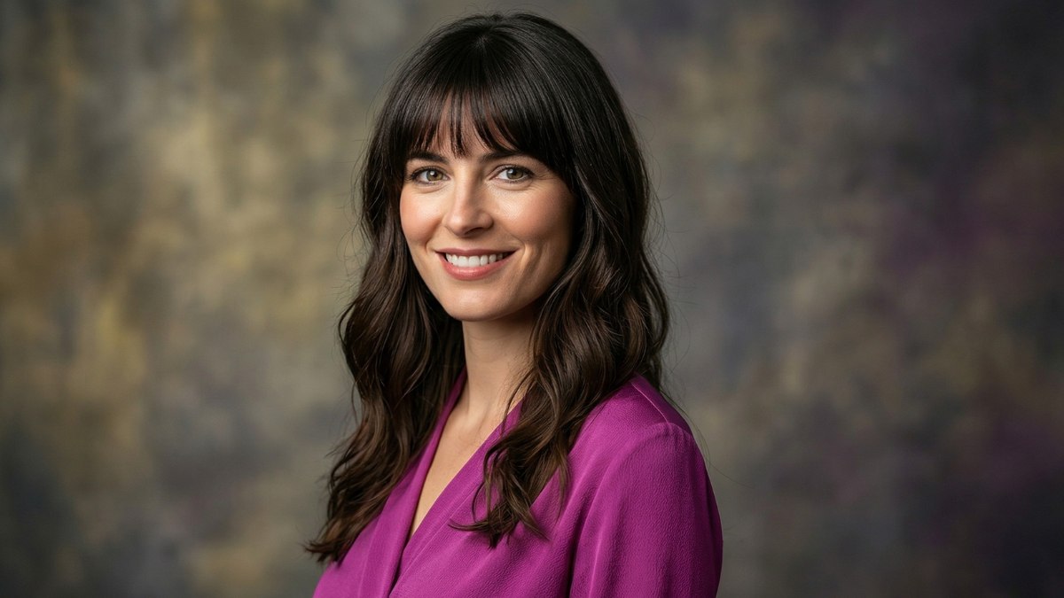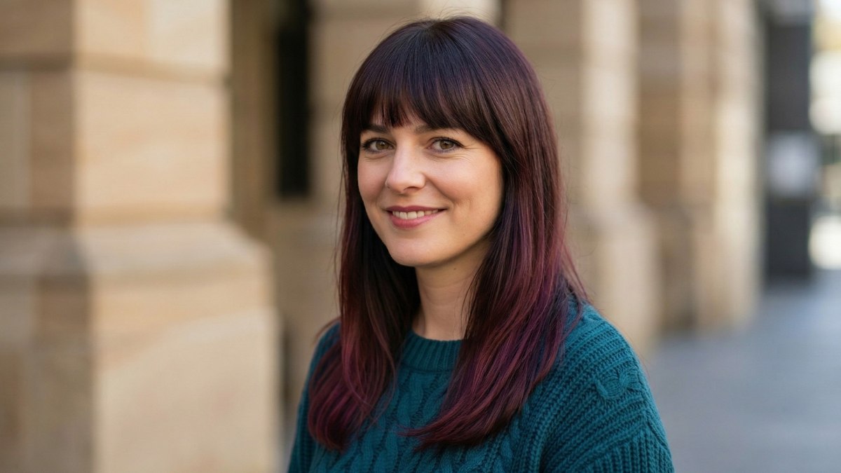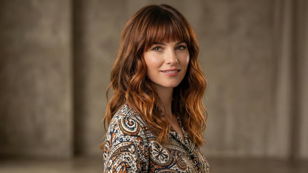 The fringe is soft and casual, swept gently to one side and blending into the rest of the hair so naturally that it is hard to tell where the bangs end and the layers begin. This is not a structured or heavy fringe. It is light and breezy, which fits perfectly with the overall spirit of the look.