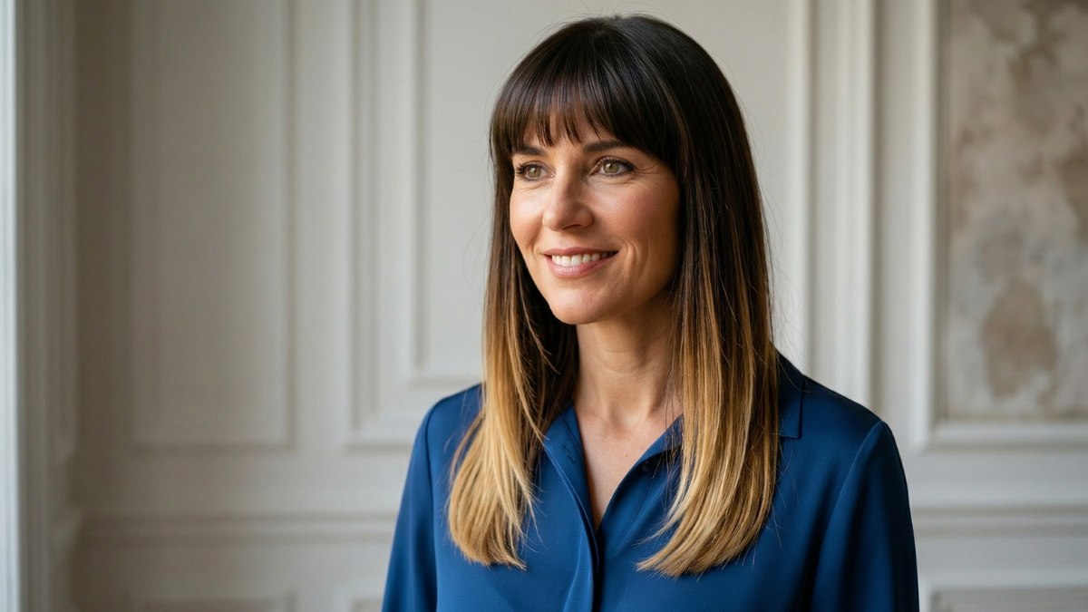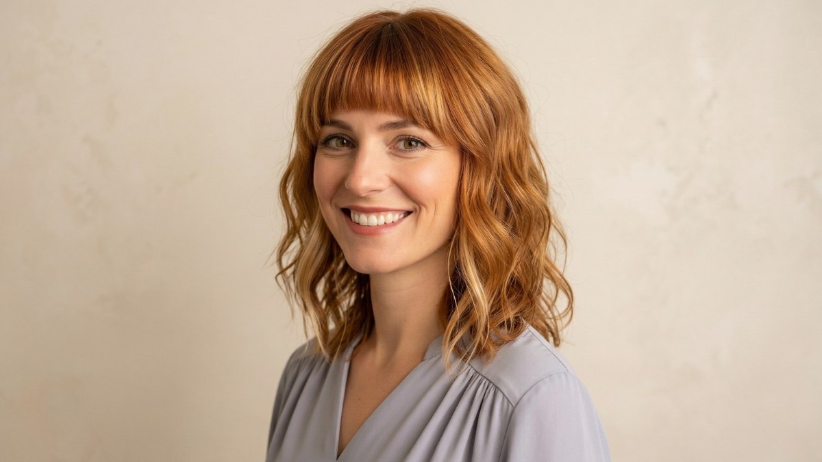 The bangs here aren't harsh or blunt; they're soft and slightly rounded, blending into the rest of the hair in a way that feels very natural. This type of fringe is often called curtain bangs. It's the kind of fringe that looks like you were just born with it.