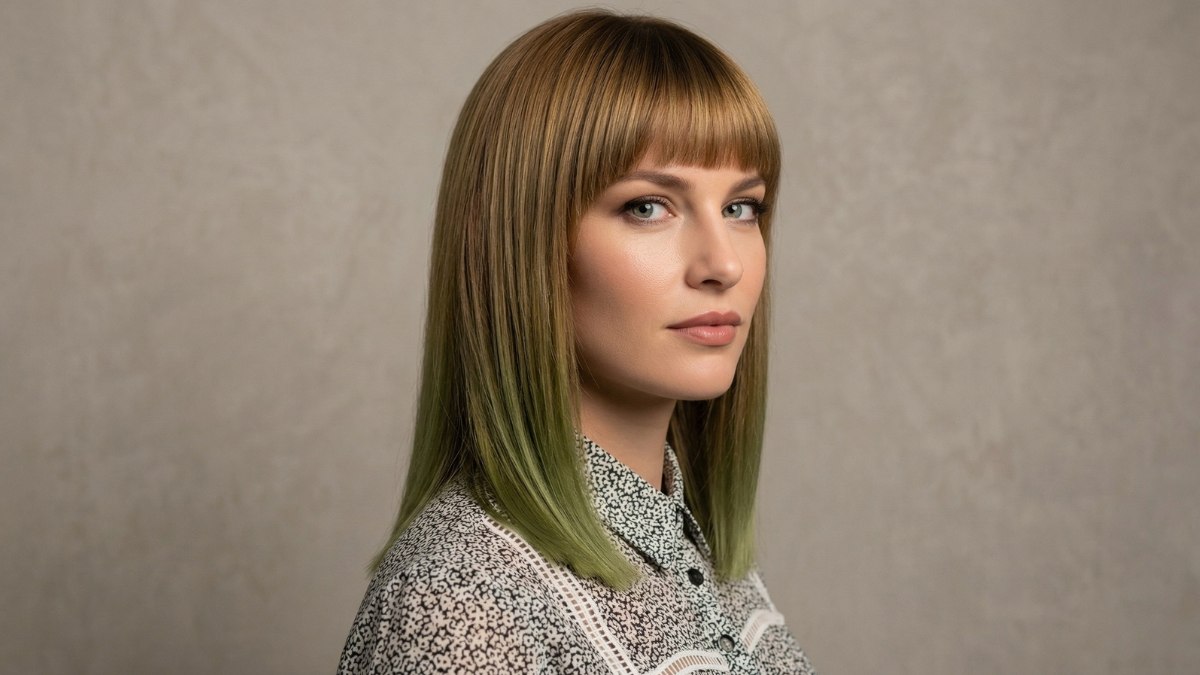 Some hairstyles play it safe. This one doesn't and that's exactly what makes it so exciting. This long style pairs a perfectly blunt fringe with a bold, nature-inspired color story that goes from warm golden brown at the roots all the way down to a cool, mossy olive green at the tips.