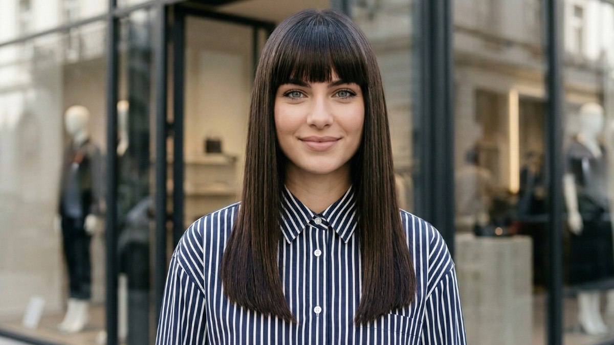 Dark, glossy, and sharp, this look combines long hair with a full, blunt fringe for a style that is modern, geometric, and incredibly striking. The hair is a deep brown - almost black - and worn smooth and straight, ending well past the collarbone.