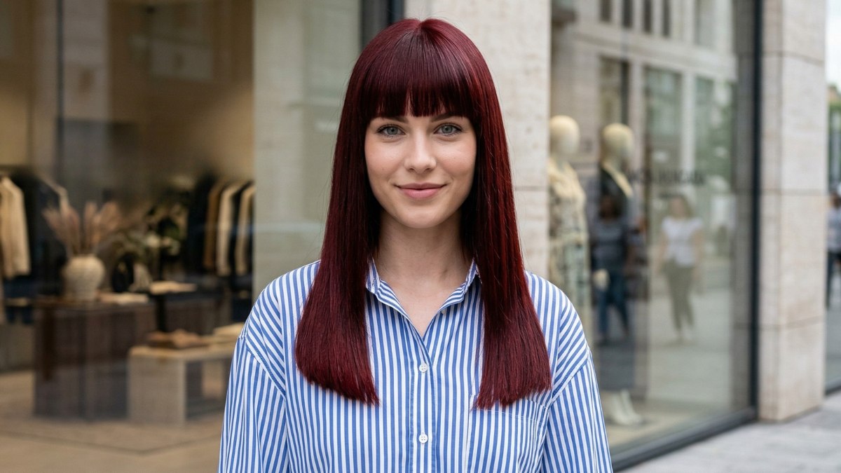 Long, burgundy-red hair with a full fringe and a smooth, straight finish is not a style that blends into the background. The hair color is a deep red with burgundy undertones; warm enough to look natural but vivid enough to be stunning. It's the kind of color that changes in different light, looking almost dark brown indoors and brilliantly red in the sun.
