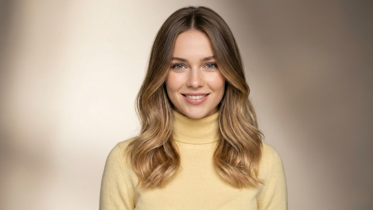 When paired with a soft, butter-yellow turtleneck, the warm tones in the hair and the outfit work together perfectly. The whole look - from the golden highlights to the pale yellow sweater - feels sunny, friendly, and very stylish.