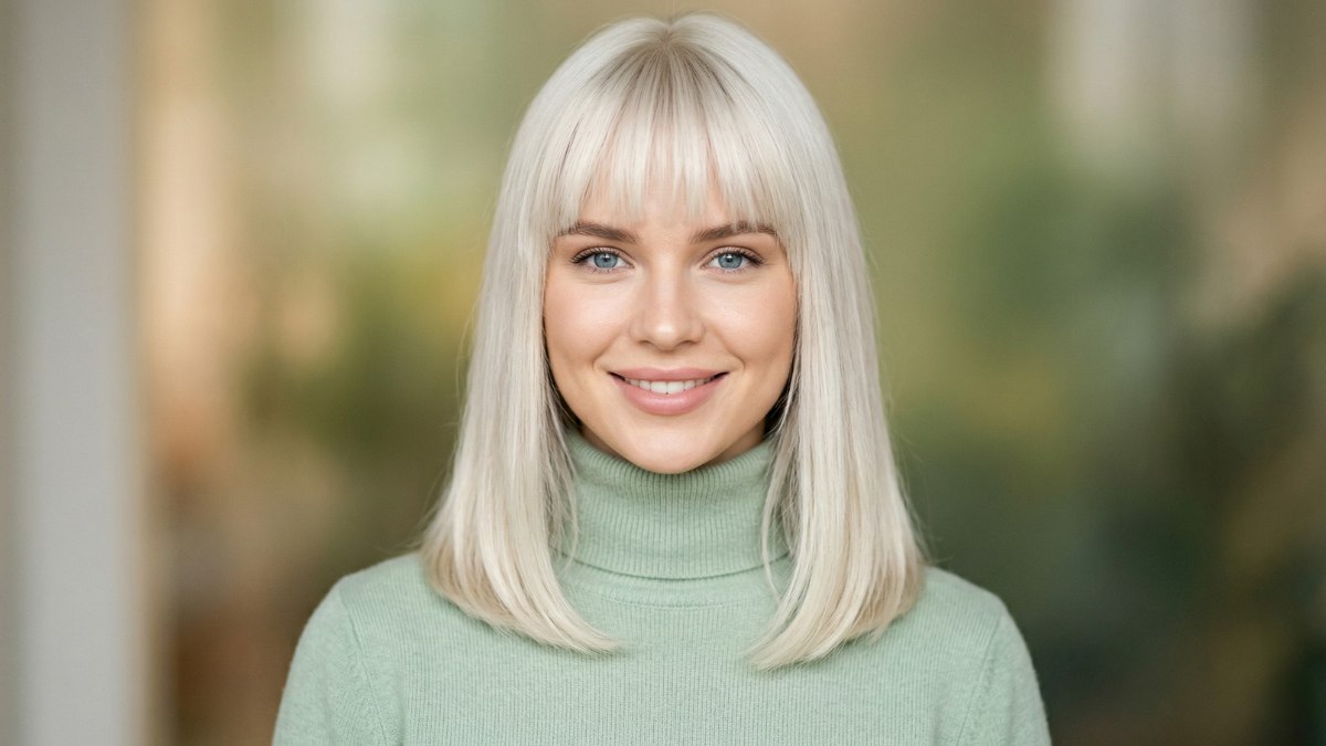 This style feels like a breath of fresh air. The hair is a stunning shade of blonde that is so pale it almost seems to glow. It sits somewhere between platinum and pearl, and it looks beautiful against the green turtleneck. It is a bold choice, but it feels classy rather than loud.