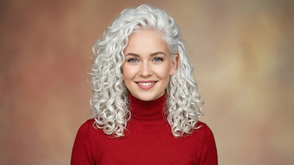 Volume is the main event in this stunning hairstyle. These bright white curls are full of energy and look amazing against the deep red of the turtleneck. The contrast between the white hair and the red fabric is enough to make anyone stop and look.