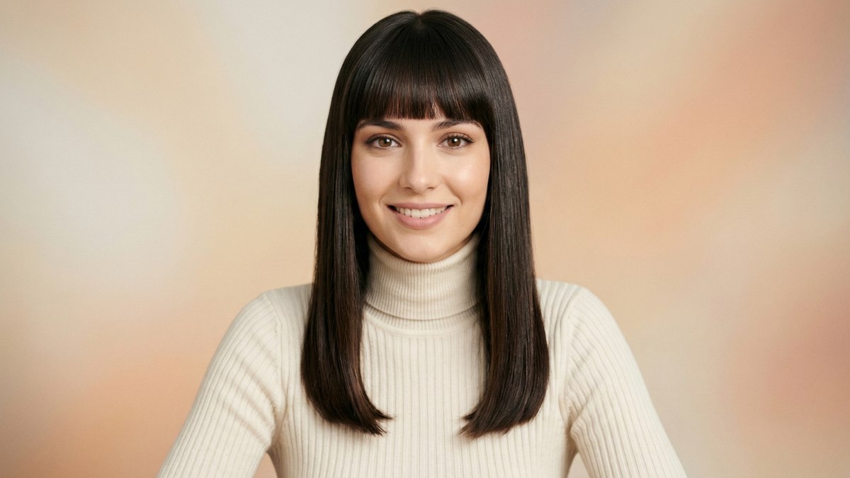 The hair falls below the shoulders in a sharp, straight cut. This isn't a style that hides behind soft layers; it is precise, modern, and confident. Paired with a warm terracotta turtleneck, the deep brown hair feels even more inviting.