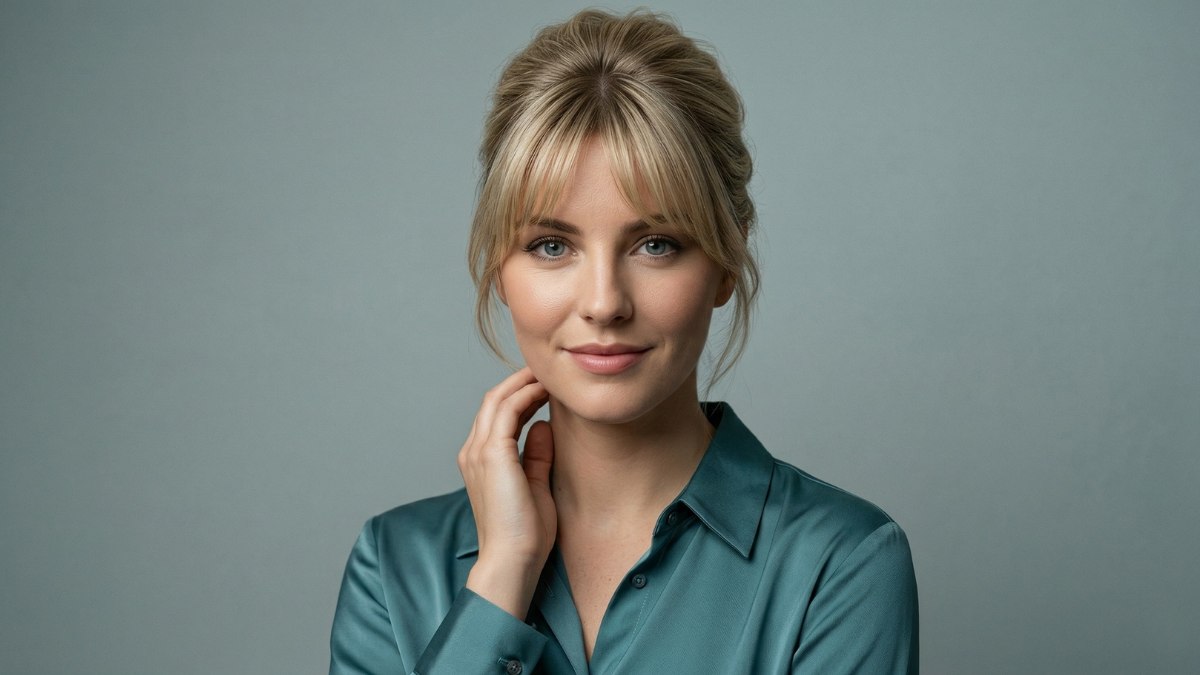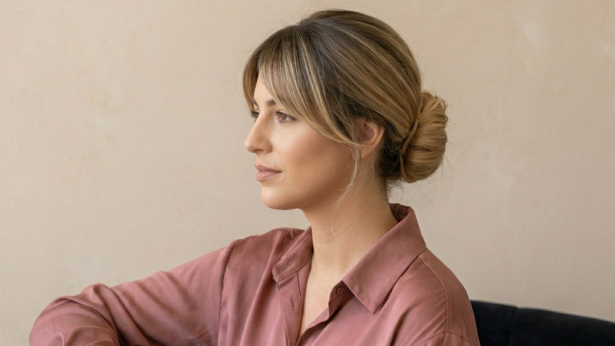 The bun is soft and gently rounded, with just the right amount of texture to keep it from feeling too stiff or old-fashioned. A few loose, fine pieces of hair curl naturally around the ears and the back of the neck, giving the whole look a relaxed feel that makes it seem friendly rather than untouchable.