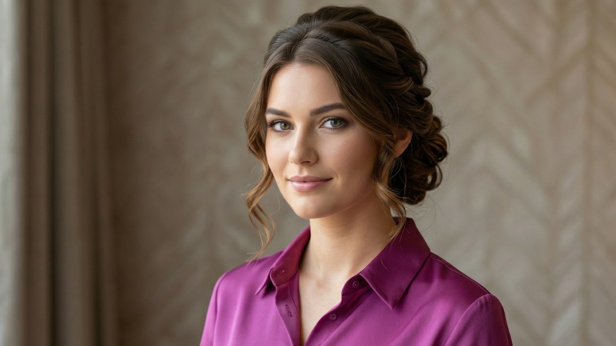 At the front, loose strands of hair frame the face softly. This gives the style a relaxed, lived-in feel that keeps it from looking too stiff or formal. These wispy pieces are small details that make the entire hairstyle feel natural and easygoing.