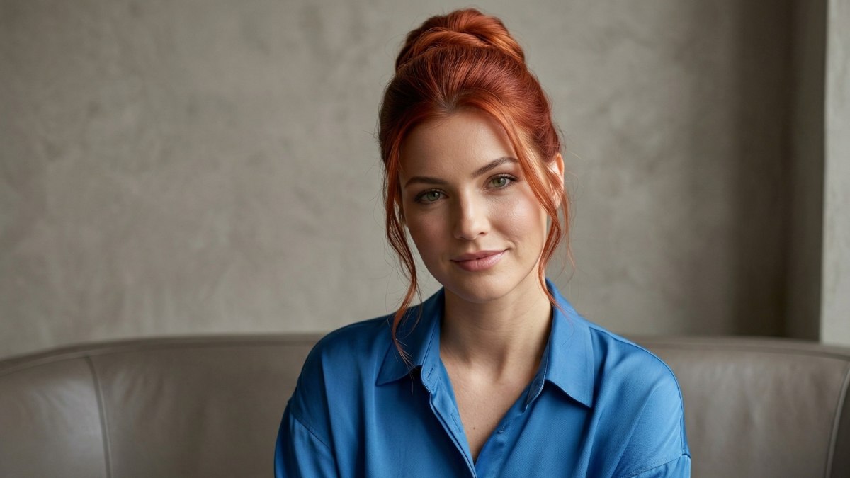 A braid wraps around the base of the bun in a tight, beautiful pattern. This braided detail is exactly what takes the look from simple to special. The contrast between the smooth hair on top and the textured braid creates a look that feels both classic and modern at the same time. Plus, the warm red hair color makes the texture of the braid stand out even more.