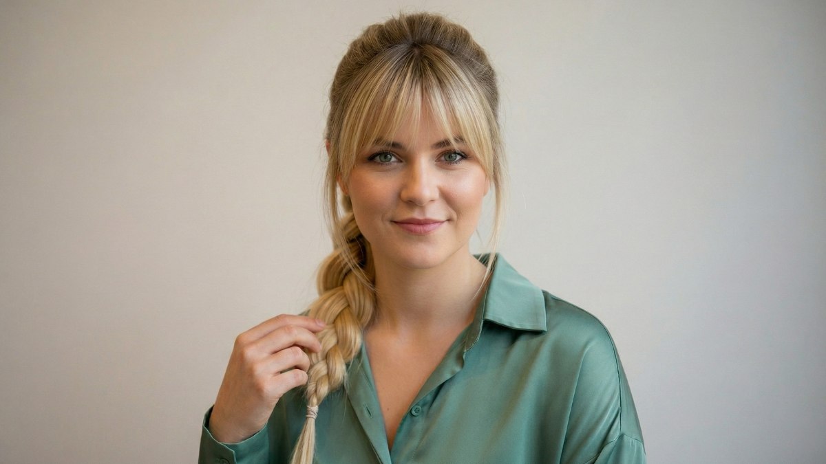 At the front, a few soft wisps of hair have been left loose to frame the face gently and these small, free strands are very important to the look. Without them, the style might feel a bit too serious or severe. Instead, they add a softness that balances out the structure of the braid and keeps the whole look feeling warm and approachable.
