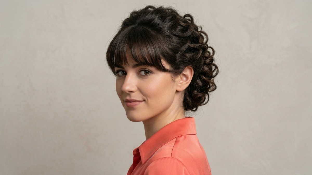 At the front, wispy bangs frame the face softly with a natural fall. They give the look a slightly classic or retro feel, reminding us of the kinds of hairstyles you might see in old photographs. However, the look is brought fully into the present by the boldness and volume of the curls at the back.